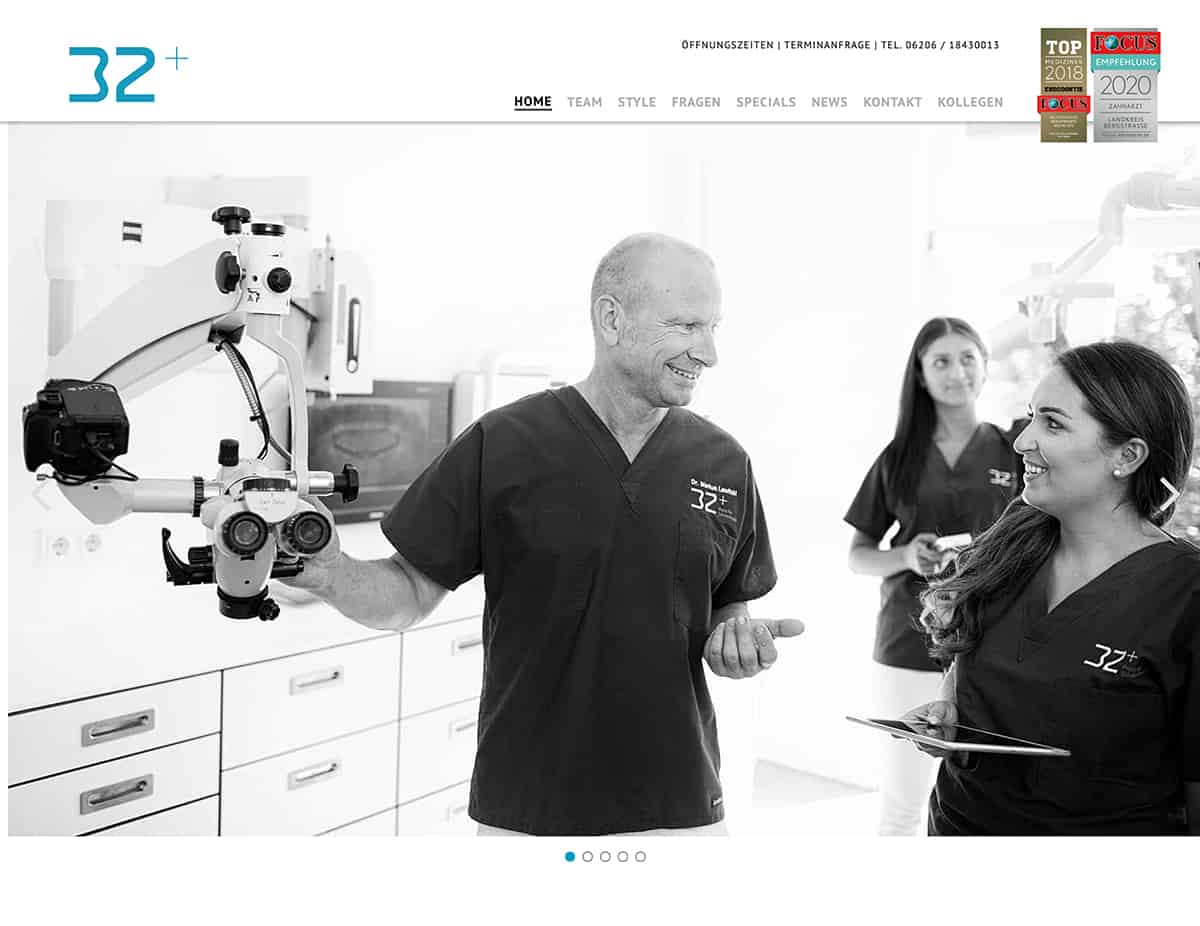 Für die Website Praxis32+ wurde aus einem vorgegebenes Layout ein WordPress Theme programmiert. Durch eine Sticky Navigation Bar ist es jeder Zeit möglich Kontakt aufzunehmen oder eine Terminanfrage über das Formular zu stellen.